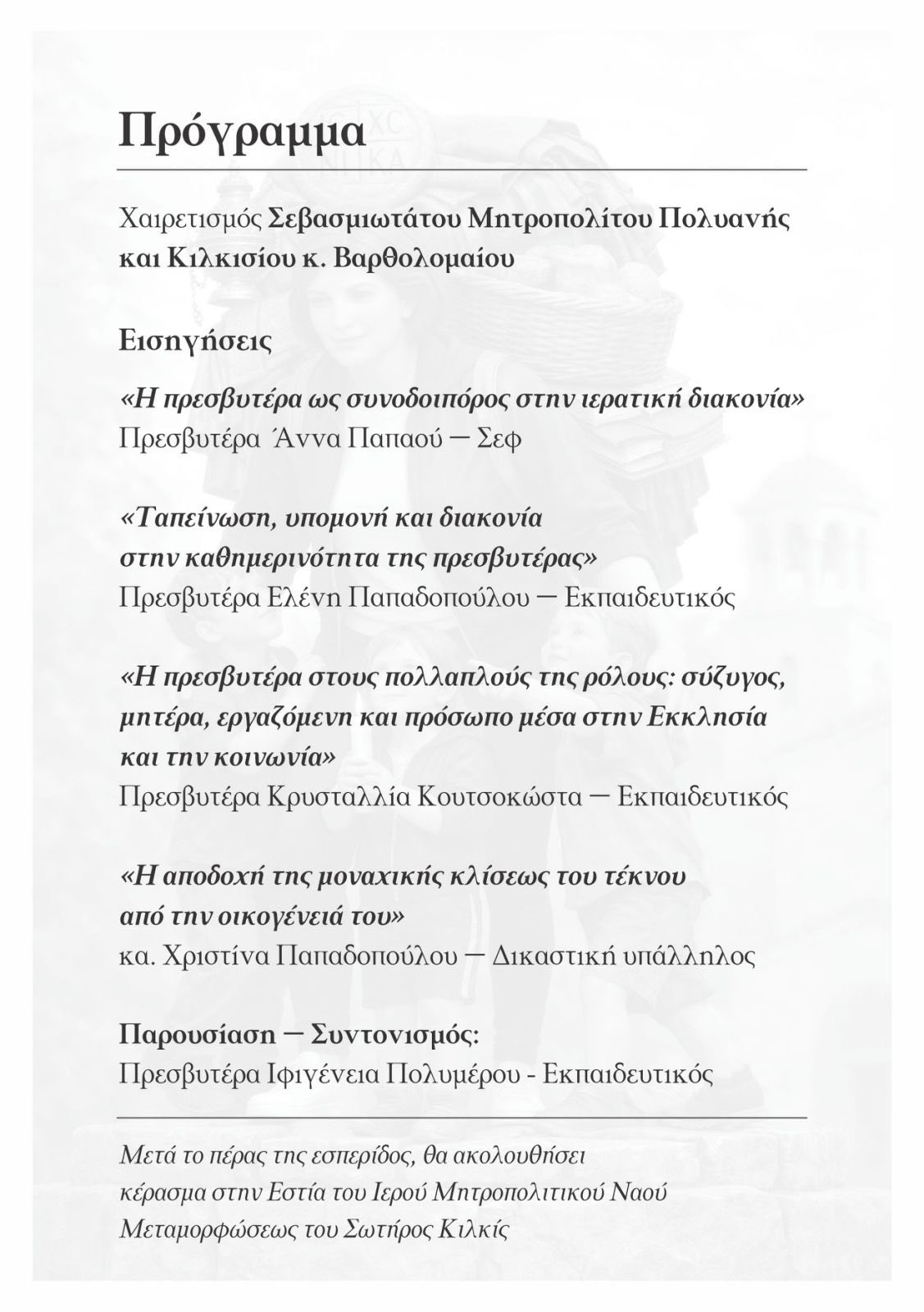 - Την πρεσβυτέρα Ελένη Παπαδοπούλου, εκπαιδευτικού, με θέμα: «Ταπείνωση, υπομονή και διακονία στην καθημερινότητα της πρεσβυτέρας».