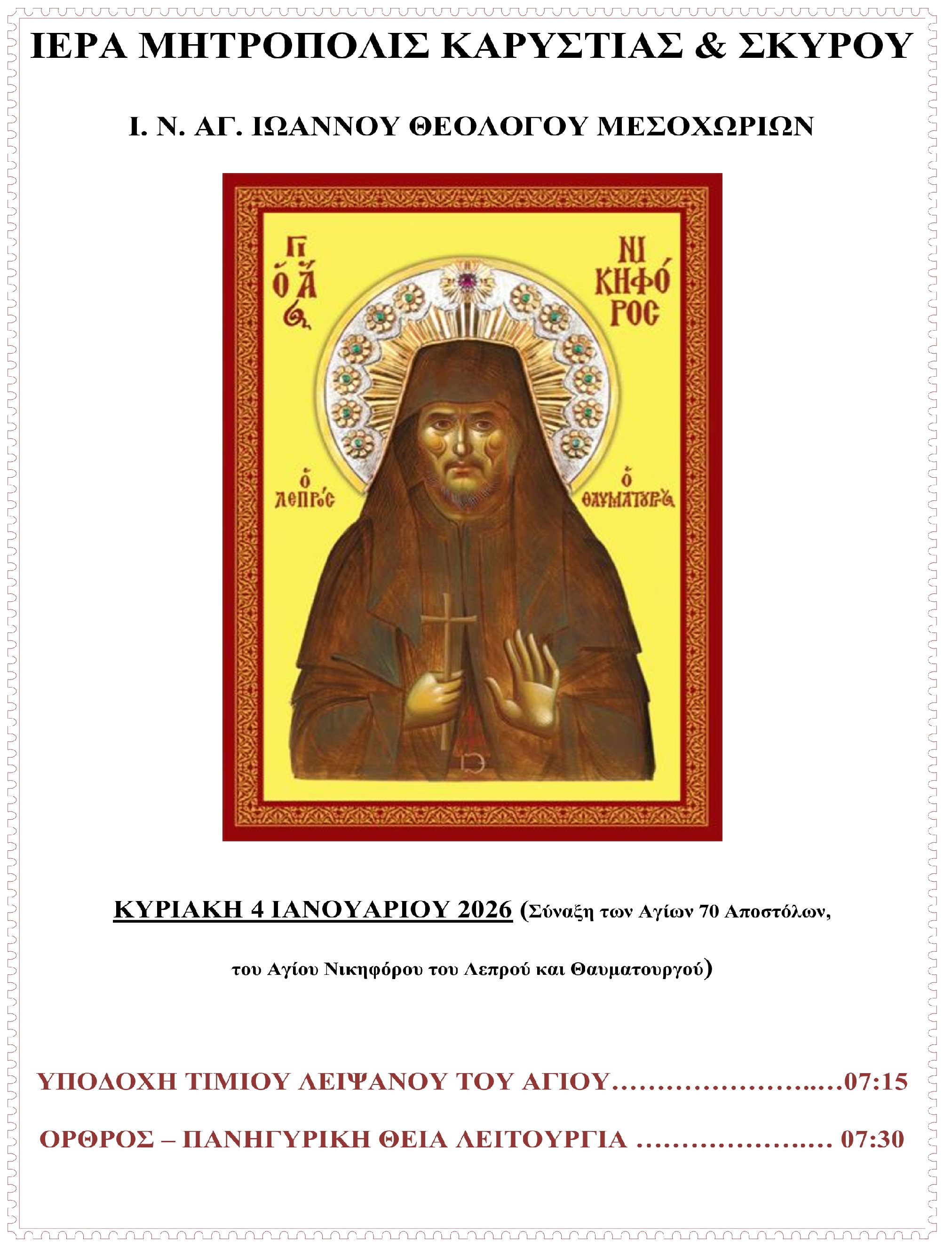 Όπως έχει γνωστοποιηθεί, την Κυριακή 4 Ιανουαρίου 2026, οι Ιεροί Ναοί: